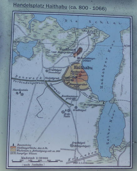 Ein 1,3 km langer und bis zu 10 m hoher Halbkreiswall umfängt das 26 ha große ehemalige Siedlungsgelände der wikingerzeitlichen Handelsstadt Haithabu. Vom Anfang des 9. bis zur Mitte des 11. Jh. war Haithabu eine blühende Hafenstadt. In der 2. Hälfte des 10. Jh. wurde die Stadt durch einen mächtigen Wall geschützt.