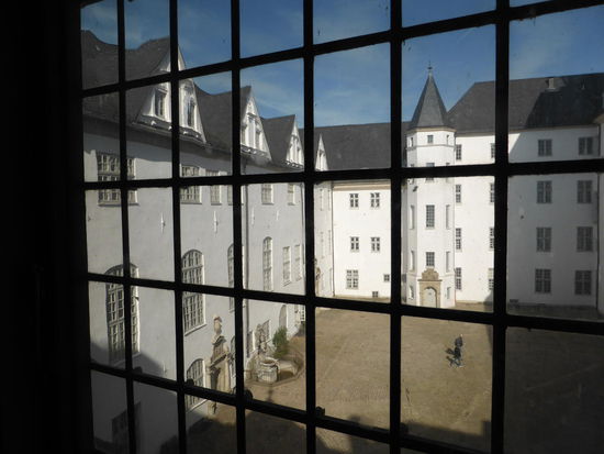 Bevor wir eine Etage höher zu den Moorleichen wechseln, werfen wir noch einen Blick hinunter in den östlichen Innenhof des Gottorfer Schlosses.