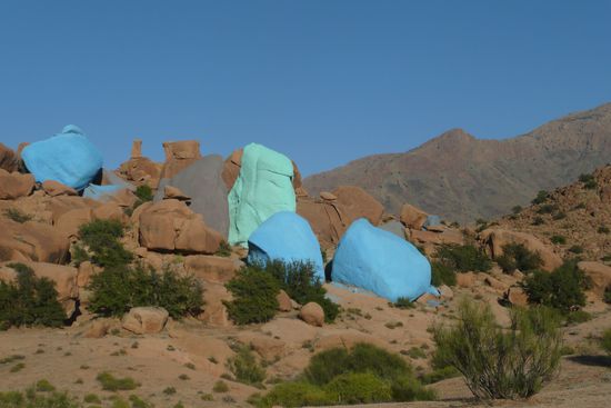 4 km südlich von Tafraoute liegen die "Blauen Steine", Kunstwerke, geschaffen aus Felsen und 20.000 kg Farbe. Diese wurde nach altägyptischen Rezepten von dem belgischen Künstler Jean Vérame hergestellt, der die bis zu 30 m hohen Felsen auch bemalte. Das Gesamtkunstwerk in den Farben Blau, Rot, Violett und Schwarz fügt sich harmonisch in die Landschaft ein, die von Granitfelsen umrahmt wird. Je nach Tageslicht verändern sich die Farben und geben ein phantastisches Schauspiel ab.