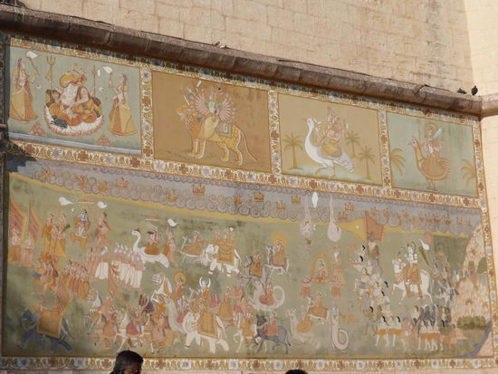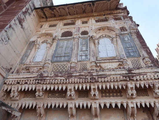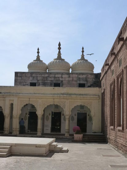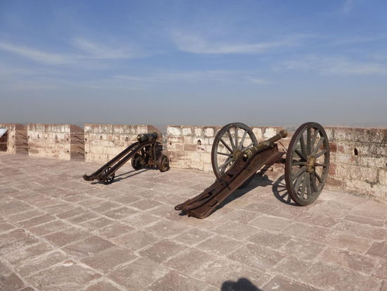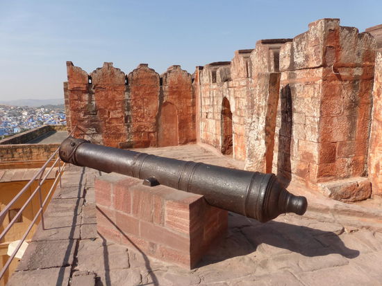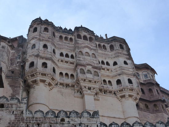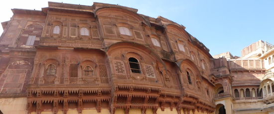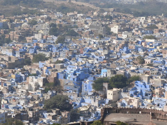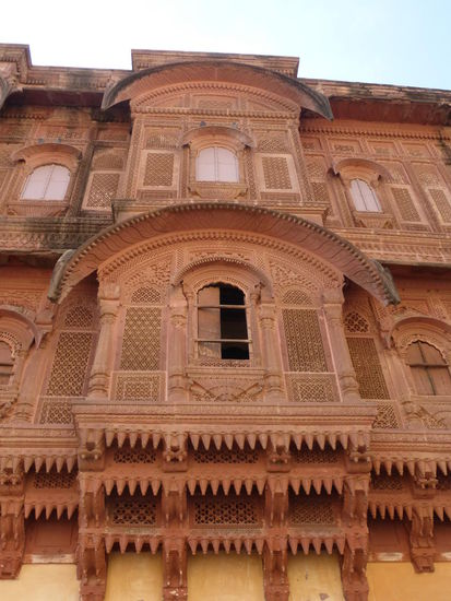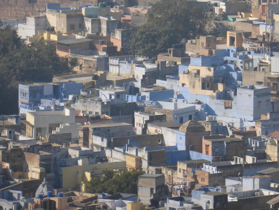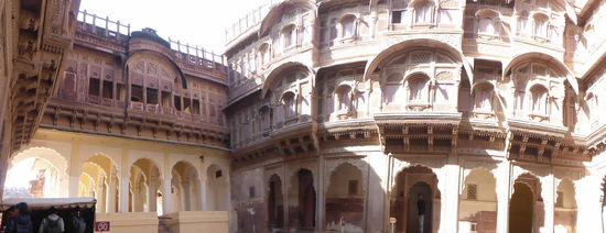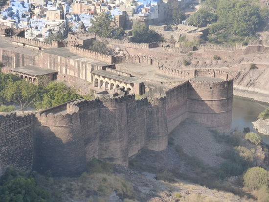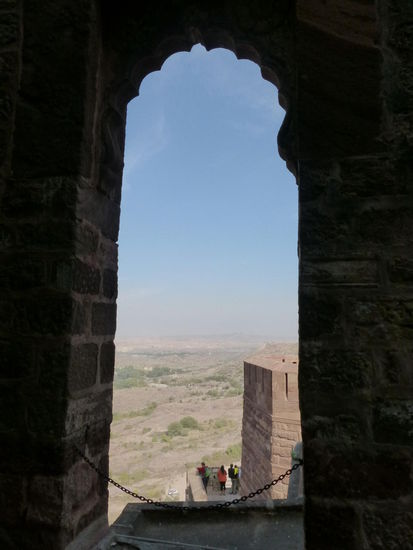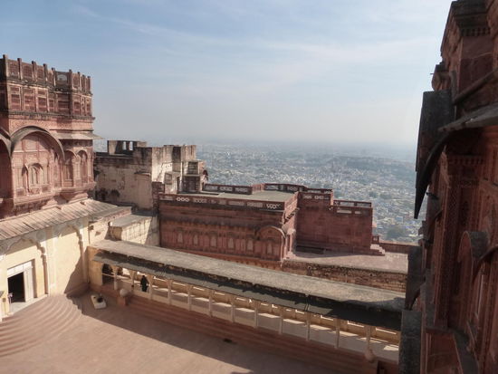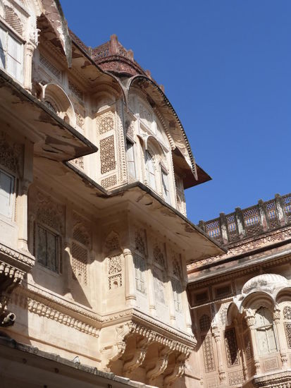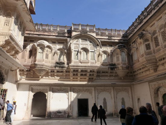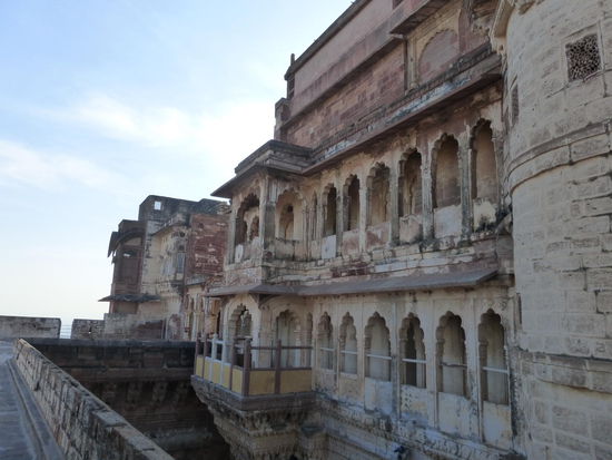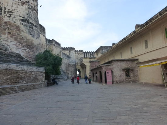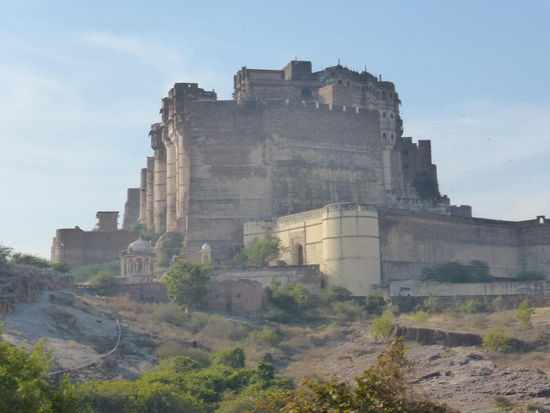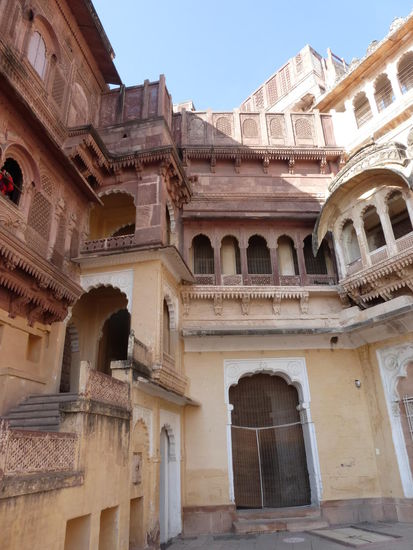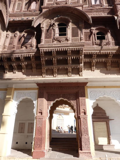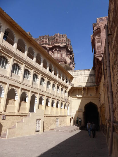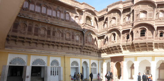 Heute stand der Besuch des Meherangarh Forts auf meinem Programm. Das trohnt hoch oben über Jodhpur und ist das Wahrzeichen der Stadt . Der Bau begann unter dem Gründer von Jodhpur " Rao Jodha " mitte des 15. Jh. und wurde mitte des 17. Jh. unter Jaswant Singh vollendet. Von den 7 Festungstoren ist das Jaya Pol ( Siegestor ) anlässlich des Sieges von 1809 sicher eines der bekanntesten. An den beiden Toren des Loha Pol sind auch heute noch 32 Handabdrücke als letzte Erinnerung von Prinzessinen der verschiedenen Maharajas zu sehen die sich auf dem Scheiterhaufen Ihres verstorbenen Mannes mit verbrennen ließen ( Sati Kult ). Das Museum im Palast des Forts gehört zum umfangreichsten und besten in ganz Rajasthan. Nach dem ich ja u.a. schon das Amber Fort in Jaipur besucht habe von dem ich sehr beeindruckt war muß ich sagen das mir das Meherangarh Fort fast noch ein bisschen mehr gefallen hat obwohl die Preise der Tikets für indische Verhältnisse sehr hoch waren was ich während dieser Reise aber noch öfters erleben sollte. Ein trauriges Ereignis aus der jüngsten Vergangenheit ist mit dem Chamunda Devi Tempel verbunden der mitten im Meherangarh Fort liegt : Als am 30. September 2008 nach einer Bombendrohung einen Massenpanik entstand wie sie leider an religiösen Orten besonders in Indien immer wieder vorkommt starben dabei 224 Menschen.