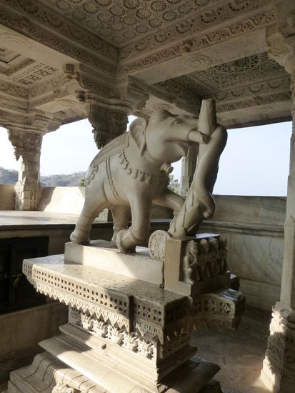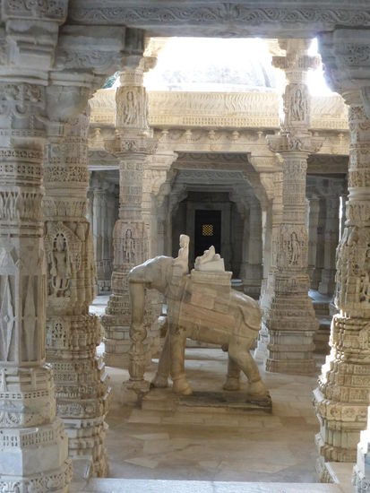 Weiterer Elefant mit einigen der 1444 reich verzierten Marmorsäulen im Jain Tempel