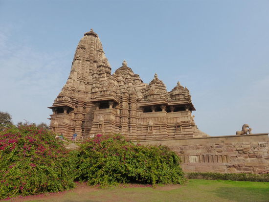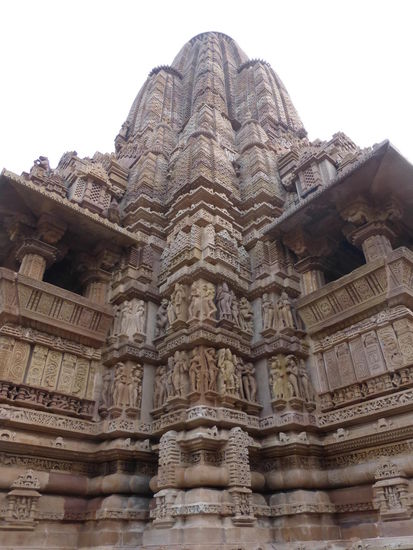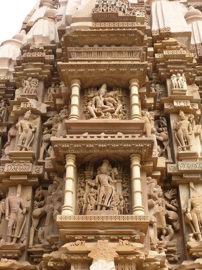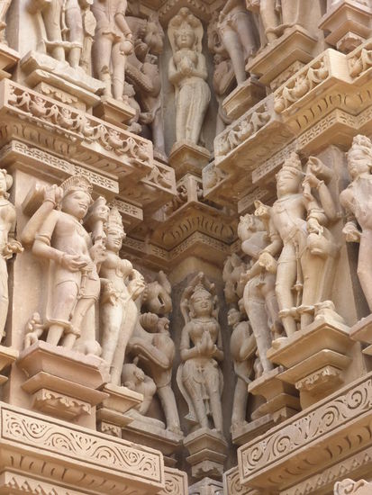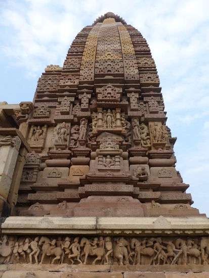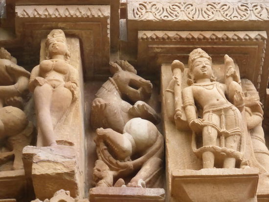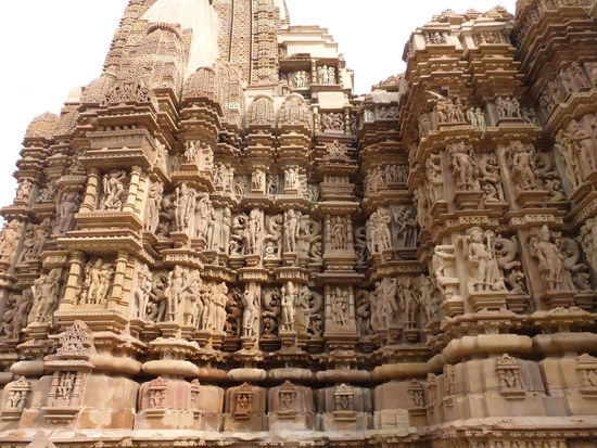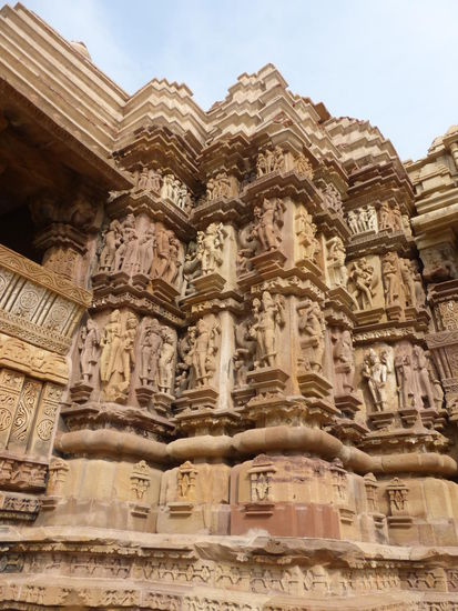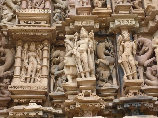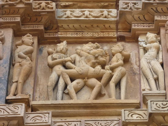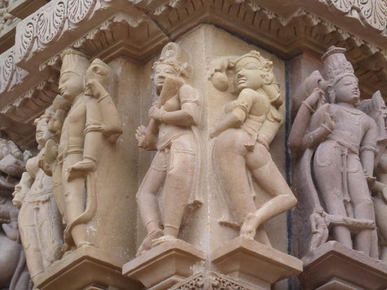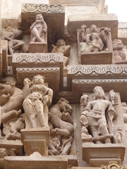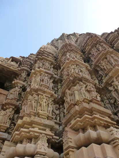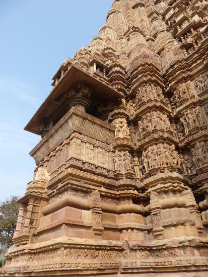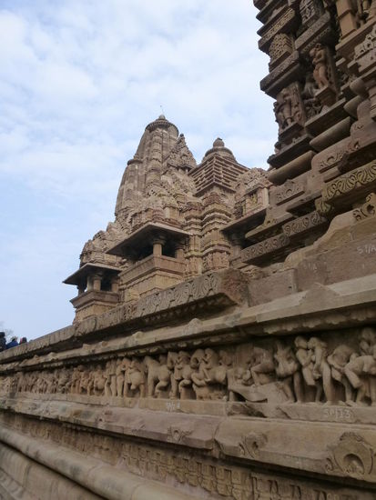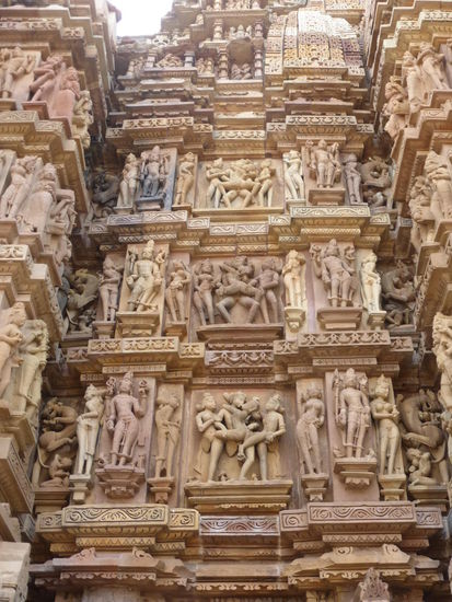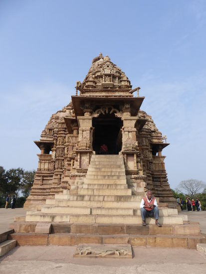 Nachdem ich gestern schon einen kleinen Einblick bekommen habe von den Jain Tempeln der Ostgruppe in Khajuraho geht es heute zur Westgruppe mit Ihren Hindu Tempeln. Khajuraho war ab den 7. Jh. Hauptstadt des Chandela Reiches von der aus die Familie der Rajputen große Teile von Zentralindien beherrschte. Während Ihrer Blütezeit zwischen 950 und 1100 erbauten die Chandelas über 80 Tempel von denen heute noch etwa 20 erhalten sind. Sie gelten auch heute noch als die bedeutensten Beispiele der indo - arischen Architektur in Indien. Einmalig ist vor allem auch der Skulpturenreichtum mit Ihren Tänzern , Bauern , Könige , Götter , Krieger , Elefanten und vielen anderen Motiven. Der Hauptgrund für die lange Anreise von Zehntausenden Besuchern jährlich dürften jedoch die vielen erotischen Szenen sein für die Khajuraho auch über die Grenzen Indiens hinaus bekannt ist. Erotische Darstellungen sind auch im Hinduismus nichts ungewöhnliches doch nirgendwo ist es so phanasievoll und Detailgetreu zu sehen wie hier. Wenn man sieht wie prüde und rückständig ein großer Teil der indischen Bevölkerung heute ist wo Frauen und Mädchen vergewaltigt oder auch sonst wie schlecht behandelt werden und als nicht besonders " wertvoll " gelten wundert man sich wie offen und tolerant man in früherer Zeit auch im Hinduismus mit Sexualität umgegangen ist. Seit 1986 gehören die Tempel in Khajuraho zum UNESCO  WELTKULTURERBE .