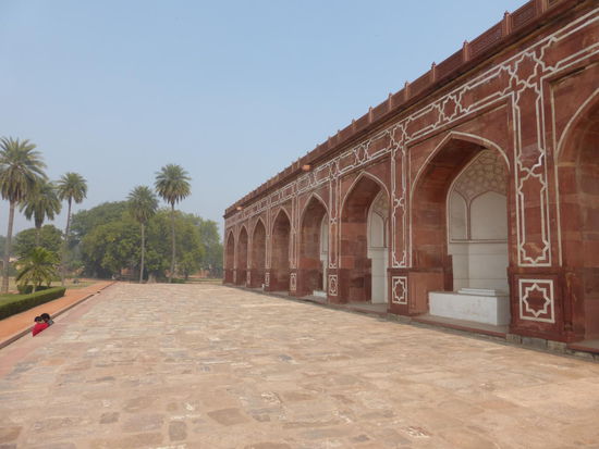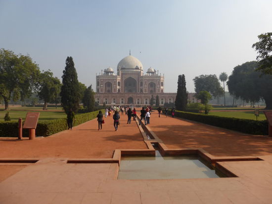 Am frühen Nachmittag meines zweiten Tages in New Delhi besuchte ich meine letzte Station in diesem Stadtteil der indischen Hauptstadt das Humayuns Tomb. Es wurde nach dem tragischen Tod von Humyun 1556 von seiner Witwe in Auftrag gegeben und in der Zeit von 1562 bis 1570 vollendet. Mit seiner 43 m hohen Marmorkuppel gilt das Mausoleum als eines der ersten und auch schönsten der frühen Mogul Epoche. Nach seiner Rückkehr aus dem persischen Exil brachte Humayun eine ganze Reihe Architekten mit die der bisher überwiegend hinduistischen geprägten Baukunst viele neue islamische Elemente einbrachten was man am Humayuns Tonb überall sehen kann wie z.b. am Portalbogen. Die Gartenanlage ist typisch für die Mogul Architektur und die erste auf indischen Boden. Auffallend ist bei diesem Bauwerk das hier die sonst üblichen Minarette noch fehlten die man später bei den nachfolgenden Bauten überall sehen kann. Diese Mausoleen wie z.b. das Bibi Ka Maqbara in Aurangabad ( siehe auch mein Reisebericht Westindien ) das Akbar Tomb in Sikandra , das Itimad Ud Daula in Agra und besonders das Taj Mahal ebenfalls in Agra zeigen diesen Baustil während seiner Blütezeit in all seiner Perfektion. Neben Humayun sind später auch seine Witwe und ca. 100 weitere Familienmitglieder hier beigesetzt worden. Das Mogulreich existierte vom Anfang des 16. Jh. bis Anfang des 19 Jh. als die Briten die Macht übernahmen. Das Kerngebiet erstreckte sich von Delhi über Agra in Nordindien bis Lahore im heutigen Pakistan. Einige Bauwerke aus dieser Zeit habe ich ja schon in den letzten 2 Tagen besucht wie das Red Fort und die Jama Moschee in Old Delhi oder auch das Safdar Jang Tomb in New Delhi und einige andere besonders in und um Agra werde ich noch am Ende meiner Reise besuchen. Charakteristisch für viele Bauten besonders in den Anfangsjahren war der rote Sandstein nach dem nicht zuletzt auch die Forts in Delhi und Agra benannt sind. Später ging man auch zu anderen Materialien über wie z.b. weißen Marmor am Taj Mahal. Der Aufenthalt hier gehörte zu meinen ersten größeren Highlights auf meiner Nordindienreise. Seit 1993 gehört die Anlage zum UNESCO WELTKULTURERBE !!