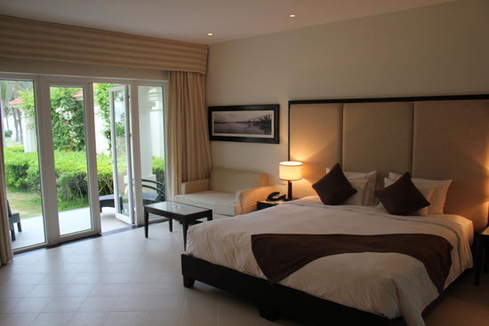 Unser Zimmer im Boutique Hoi An Hotel war wirklich schön. In der ersten Etage eines Hauses mit vier Zimmern gelegen, zwar nur Aussicht auf den Garten aber dennoch schön. Trotzdem kam uns das Zimmer nicht wie das vor, was wir erwartet hatten und so konsultierten wir unsere Reiseunterlagen um festzustellen, dass wir zu unserer gebuchten Leistung ein gratis Upgrade in die nächste höhere Zimmerkategorie zugute hätten, so diese auch verfügbar sei.