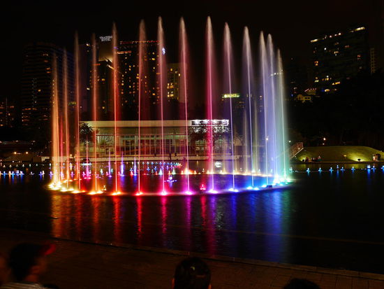Plötzlich tauchen sie vor einem auf, mit immenser Strahlkraft, sehen einfach fantastisch aus, die beiden Türme. Noch beeindruckender als am Tage. Durch die belebte Mall ging es auf die andere Seite in den Park. Dort gibt es jeden Abend für den geneigten Zuschauer eine tolle Show in Sachen Wasserspiele.