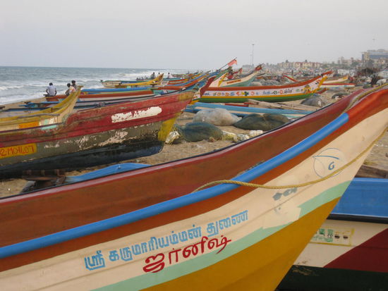 Am Fishermen Beach roch es ... naja ... gelinde gesagt "fischig". Überall lagen Fischernetze herum, daneben die bunten Boote der Fischer, am Straßenrand wurden die letzten Reste des Tagesfangs veräußert. Ich nehme an, das wirkt morgens appetitlicher als abends. Meine Füße habe ich kurz in den badewarmenwarmen Indischen Ozean gehalten - krass, dass ein Meer so warm sein kann. Und: die Haut ist noch dran ... ein Ganzkörperbad würde ich allerdings am Stadtstrand nicht wagen (ganz abgesehen von fiesen Unterströmungen, die es hier geben soll).