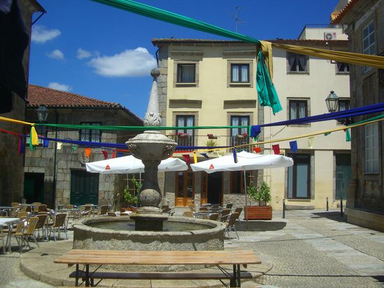 Über den Fluss, erstmal Rast am Ufer, und dann durch die netten Altstadtgassen und ueber den Mittelaltermarkt, der gerade stattfindet. Zweieinhalb schön verbrachte Stunden und eine Kartoffelsuppe später mache ich mich weiter auf den Weg nach Norden - und der wird noch anstrengend! Leicht und teilweise auch steil bergab durch eher öde Vororte und über - oh Wunder - Kopfsteinpflaster, vorbei an noch mehr Kirchen und dann endlich wieder ins grüne Land. Durch noch mehr malerische Weinlauben und Eukalyptushaine kommt man schließlich nach Tamel, nochmal steil den Berg rauf und dann empfängt mich eine herrliche Pilgerherberge: hier wurde an alles gedacht (nette Hospitaleria, guet Waschmöglichkeiten, Getränkeautomaten...). Geduscht, Wäsche gewaschen und dann aaaaaaaahhhhhh: mit einem eiskalten Superbock in die Abendsonne! Perfekt. Und jetzt gibt es sogar noch Internet, um diesen Reisebericht hochzuladen. Ich bin restlos begeistert und wünsche allen, ob nun unterwegs oder zu Hause, einen "BOM CAMINHO", denn "einen guten Weg" zu wünschen, das passt doch immer. Ich bin jedenfalls geschafft nach heute 25 Kilometern plus Sightseeing - aber ich freue mich schon auf morgen!