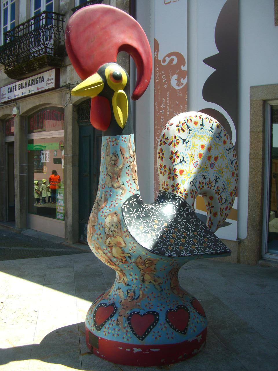 Der Hahn von Barcelos symbolisiert einen Pilger, der gerade vorm Gehängtwerden doch noch gerette wurde - durch seinen Ausruf: "Ich bin unschuldig! Der Hahn, den du gerade essen willst, König, wird krähen, wenn ihr mich hängt!" Das tat er dann auch - so die Legende - und der Pilger konnte gerade noch vom Galgen herunter gerettet werden, bevor er der Anklage des Diebstahls zur Rechtschaffenheit gezogen werden sollte. Diese Legende gibt es auch auf Stationen anderer Jakobswege - aber irgendwie ist die Geschichte ja nett.