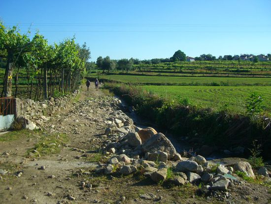 Über die zweite Etappe lässt sich zusammenfassend sagen: genauso viele Kilometer, aber noch anstrengender, und noch schöner als die erste. Mördischer Muskekater und höllische Fußchmerzen! Als ich nach 25 Kilometern in Ponte de Lima ankomme, bin ich völligst geschafft. Aber ein kurzes Bad im eiskalten Fluss Lima belebt wieder und der Blick von unserem Herbergsbalkon über Römerbruecke und Altstadt entschädigt.
