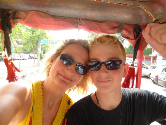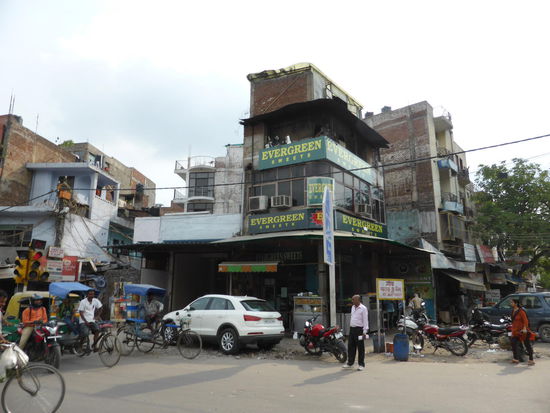 Das Zimmer ist fast identisch mit dem vom letzten Mal. Die Aircondition ist auf 18 Grad eingestellt, was wir aber schleunigst nach oben korrigieren, sonst trifft einen der Schlag, wenn man raus geht. Nach ein paar Stunden Schlaf fahren wir mit dem Tuk Tuk zum Community Center, wo wir schon beim letzten Mal einfach, aber sehr gut gegessen haben. Das offene Arabische Al Bake wird auch der Schawarma König von Delhi genannt, und das zu Recht. Hier ist es tagsüber genauso voll wie am Abend und man ergattert jedes Mal nur mit Mühe ein freies Plätzchen. Auf die leckeren Röllchen hatte Thomas sich schon gefreut, seit wir beschlossen hatten, in Delhi einen Zwischenstop zu machen. Die Jungs verputzen jeder zwei Portionen und ich bestelle Chili-Kartoffeln und vegetarische Momos. Nico isst Schawarma zum ersten Mal und obwohl sie scharf sind, zieht er sich seine zwei Portionen rein und schüttet anschließend eine Flasche Wasser hinterher. Zurück zum Hotel fährt uns ein neuartiges Tuk Tuk begleitet von Indischer Musik aus dem Handy unseres Fahrers. Es wird mit einem Elektromotor betrieben und hat zwei Sitzbänke, auf denen man sich gegenüber sitzt. Es ist komplett offen und dadurch angenehm von Luft durchweht.