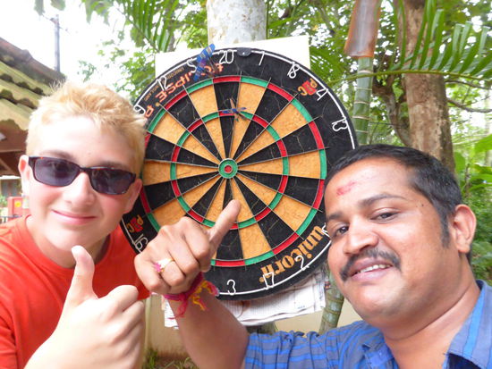 Gleich nach dem Frühstück installiert Thomas die Dartscheibe - unsere alte Palme ist leider bei einem Sturm umgeknickt - an einer anderen Palme vor unserem Cottage, verteilt die Dartpfeile und schon geht es los. Zeitweilig spielen bis zu neun Leute gleichzeitig, denn nach und nach kommt das ganze Personal und will mitmachen. Eigentlich wird bis spät in den Abend ununterbrochen gespielt, selbst als wir Abend essen gehen, geht es weiter. Unser Lieblingsrestaurant das Little Tibet öffnet leider erst im Oktober und hat auch den Besitzer gewechselt. In der Sky Lounge ist das Essen zwar gut, aber die Auswahl der westlichen Musik unerträglich. Total unpassend für ein entspanntes Abendessen mit Meeresrauschen.
