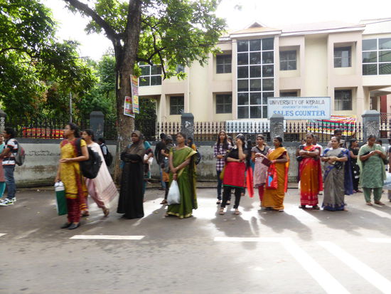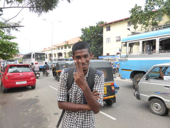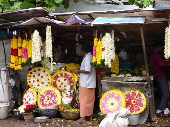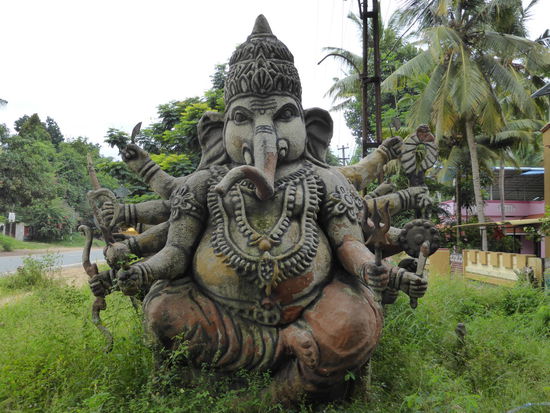 Unsere erste Tour führt uns nach Trivandrum. Wir erkennen vieles wieder, finden aber das große Shopping Center nicht. Also gehen wir in ein kleines. Wir kaufen uns einen dicken Ganesha für unseren Indischen Schrank zu Hause, einen kleineren für die liebe Katzenhüterin, zwei Schals, viele Gewürze und Thomas bekommt einen Doti (den Indischen Wickelrock für Männer). Auch dem Connemara Market statten wir einen Besuch ab. Es ist ein offener Markt ähnlich wie unsere Wochenmärkte nur dauerhaft. Abschließend wollen wir ein Thali essen, aber es wird leider nur bis drei Uhr zubereitet, ist also ein klassisches Mittagessen. Die Straßen waren viel weniger befahren als vor zwei Jahren, deshalb kommen wir gut durch und brauchen jeweils nur gut eine Stunde. Wahrscheinlich war es damals viel voller, weil das Onam Fest (siehe Reisebericht "Kerala mit Kind und Karre") in vollem Gange war. Zu diesem Fest kommen Familien und Freunde zusammen, die vielleicht sonst getrennt wohnen. Die Überholmanöver, die wir beobachten sind manchmal nicht zum Aushalten, aber Thomas ist voll in seinem Element und bringt uns wie immer sicher zurück.