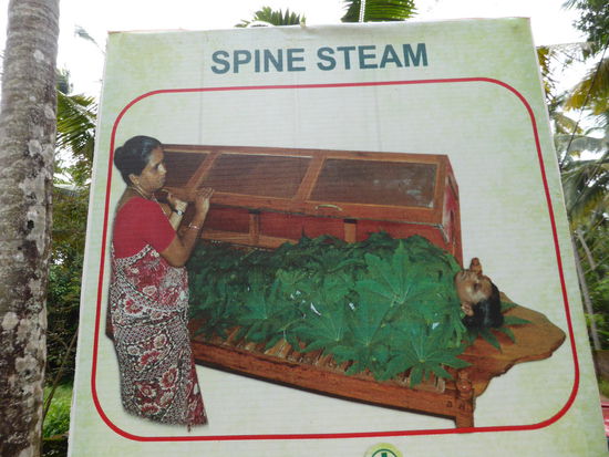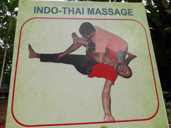 In der Stadt geben wir zwei volle Tüten mit Wäsche ab. Montag soll sie fertig sein. Ich hoffe, dass unsere Klamotten nicht wieder mit einem Kugelschreiber gekennzeichnet werden. Nach dem Mittagessen gurken wir zum Vergnügen ein wenig durch die engen kurvigen Gassen mit ihren tiefen Schlaglöchern und amüsieren uns über die Plakate auf denen verschiedene Behandlungsmethoden abgebildet sind. Die Fußmassage ist nicht für den Fuß sondern wird mit dem Fuß gemacht. Es sieht eher so aus als würde einer, der am Boden liegt getreten. Die Indo-Thai Massage sieht aus, als würde einer in den Schwitzkasten genommen und toll ist auch der Sarg, in den einer umwickelt mit Grünzeug gesteckt wird. OK, wir haben keine Ahnung von Ayurveda. Bestimmt ist es ganz toll. Nico wundert sich nur darüber, dass man für eine solche Behandlung auch noch bezahlen muss.