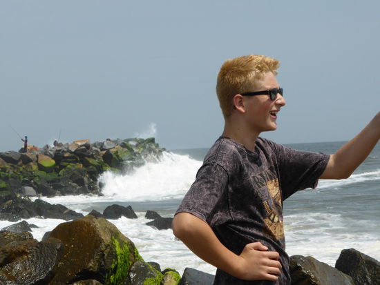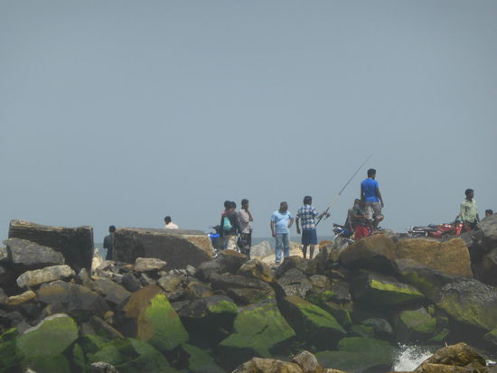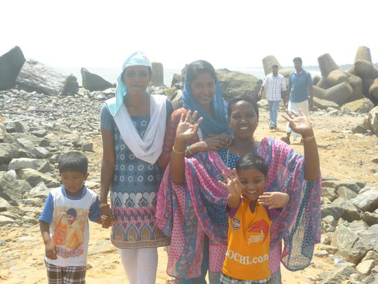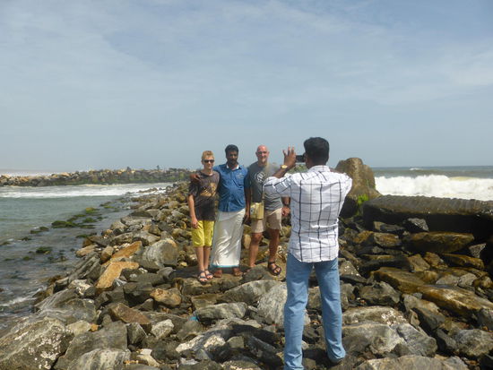 Heute Mittag fahren wir an der Küste entlang durch ein Dorf auf einer sehr schmalen Landzunge. Links die Backwaters und rechts das Meer. Die Häuschen sind alle schön bunt angemalt in verschiedensten Farben, es gibt sogar eine relativ große Kirche. Man winkt uns fröhlich zu. Wir erreichen die Stelle, wo der Fluss ins Meer mündet. Hier wurden große Felsen und riesige Wellenbrecher aufgetürmt, um die Wut der Wellen zu bremsen. Sie knallen auf die Barriere, dass es meterhoch aufschäumt. Das scheint auch für viele Inder eine Attraktion zu sein, denn es herrscht ein reges Kommen und Gehen, auf der anderen Seite ebenso, dort versuchen einige Leute zu angeln. Zwei Männer wollen sich unbedingt mit uns in den verschiedensten Konstellationen fotografieren. Dann wird es sogar uns zuviel. Weil wir vor dem Kino noch essen gehen wollen, fahren wir zurück.