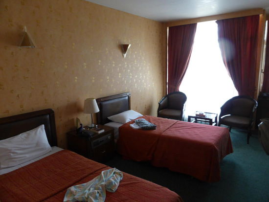 Dann beginnt die Warterei - Chaos am Paßschalter fūr Foreigner; nebenan gibt es fast eine Schlägerei. Inzwischen haben wir unsere Mitfahrer schon kennengelernt. Sie sind vor uns draußen und haben unseren Reiseleiter schon gefunden, derweil wir noch unsere Koffer am Band abholen müssen. Sie sind inzwischen die letzten, die noch mit dem Band rundlaufen. Dafür winkt der Zollbeamte und durch und wir müssen unsere Koffer nicht durchleuchten lassen. Sami stellt sich vor und bringt uns mit einem Kleinbus nicht ins vorgesehene Babat Taher Hotel sondern ins Engehlab), das auch für die letzte Nacht vorgesehen ist. In Teheran hat es ein schweres Gewitter gegeben und an manchen Stellen steht das Wasser noch am Straßenrand. Während Sami eincheckt, werden wir mit Osaft begrüßt. Ein Bier wäre uns natürlich lieber gewesen, aber das müssen wir uns unserer Leber zuliebe nun 3 Wochen abschminken. Um 23.30 Uhr sind wir endlich auf dem Zimmer und machen Nachtruhe.