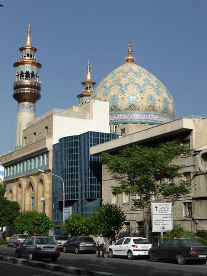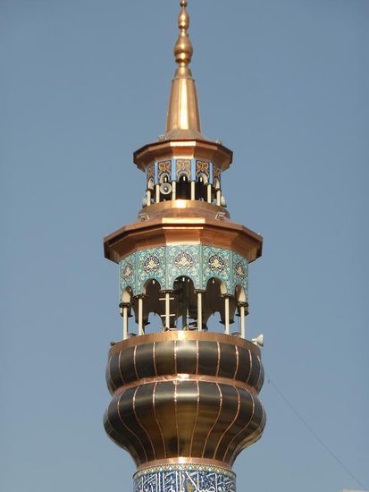 Etwa einen Kilometer laufen wir die Taleqani bis zur Vali Asr - es ist zwar keine berühmte Moschee, aber die Archtitektur ist schon beeindruckend. Außerdem scheint sie recht neu zu sein, da die Kupferabdeckungen an den Minaretten noch in ihrer Ursprungsfarbe glänzen.
