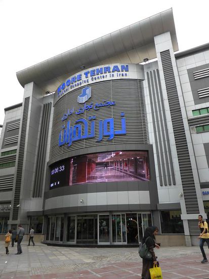 Wir gönnen uns noch einen Blick in Irans größtes Shoppingcenter und entdecken ein weiteres Gebäude mit Iwan an einem ultramodernen Bau. Ein alter Mann stapelt Eisblöcke, bei uns inzwischen völlig unbekannt. Ein Mopedfahrer will ein Stück kaufen, aber der Mann will keinen Block zerhacken.