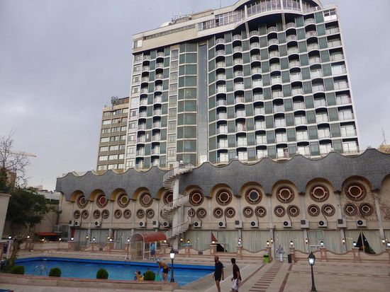 die überlebensgroßen Reitstiefel links der Eingangstreppe sind Teil einer ehemaligen Reza Shah-Statue