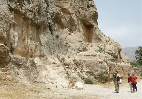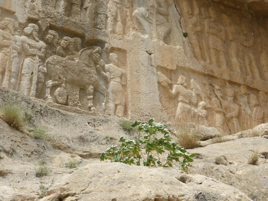 Mangels Zeit und wohl auch wegen des beschwerlichen Weges können wir die imposante 8m hohe Kolossalstatue Shapurs in der gleichnamigen Höhle nicht besuchen. Einen Eindruck erhält man aber auf der Webseite. Der letzten beiden Reliefs liegen auf der anderen Flußseite ( Investitur von Shapur I. - nicht gut erhalten.) (Sieg Shapur I. über die Römer.)
