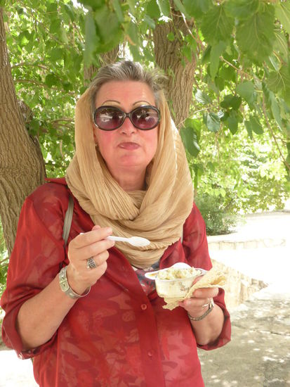 Daher erreichen wir erst gegen 19.00 Uhr die Stadt Shiraz, in der der Teufel los ist. Sogar ich möchte hier nicht selbst Autofahren. Im Aryo Barzan Hotel (****) werden wir mit einem Saft begrüßt, dafür sind die Zimmer kleiner (und das Bett auch) als gestern. Ich würde hier einen Stern weniger vergeben. Zum Abendessen bleiben wir im Hotel und zu den Lamm- und Hähnchenspießen gibt es erstmals Kartoffeln. Die vorher servierte saure Gerstensuppe schmeckt mir zunächst nicht, jedoch stärker nachgesalzen wird sie ausgesprochen genießbar.