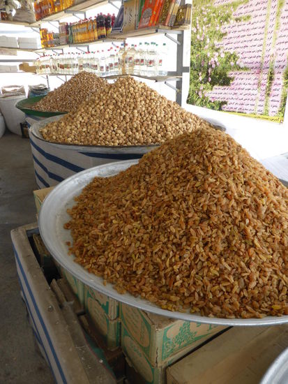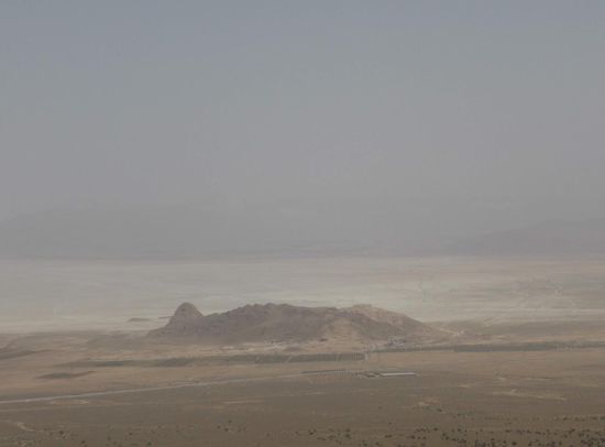 Dann geht es einen Pass auf 2000 m hoch; den Blick auf den 2. riesigen Salzsee auf 1600 m Höhe beeinträchtigt Hitzedunst. Nach dem Pass geht es nach Neyriz, wo wir bereits um 12.00 Uhr Mittagspause machen, da es im folgenden keinerlei Infrasstruktur gibt.