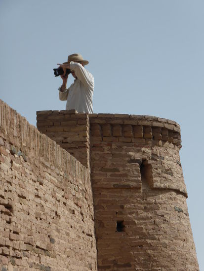 Unsere Mitreisende hat heute Geburtstag. Zum Frühstück überreichen wir ihr unser kleines Geschenk. Nach dem Frühstück verlassen wir dann Shiraz in südöstlicher Richtung Richtung Kerman. Auf der über 500 km langen Route ist nur ein Besichtigungspunkt vorgesehen: die Ruinen des sassanidischen Palastes von Servistan. Bevor wir diesen erreichen geht's allerdings zunächst an einem ersten Salzsee vorbei. Die Landschaft hier ist eine Art Steppe (Rückfensterfoto).