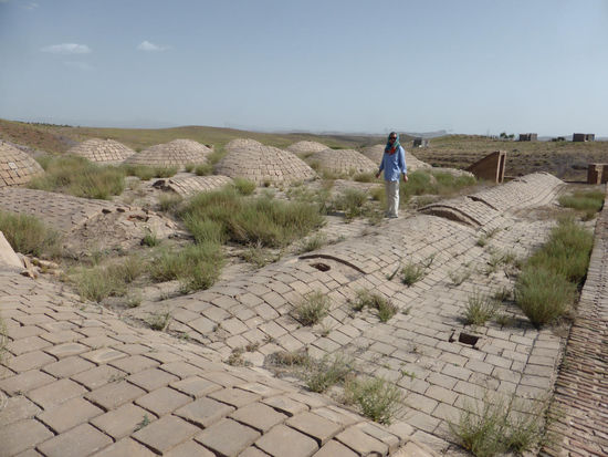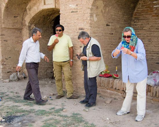 Ali kennt eine 350 Jahre alte Karawanserei (von insgesamt fünf), an der wir eine Kaffee/Teepause einlegen können und Wassermelone zur Erfrischung zu uns nehmen.