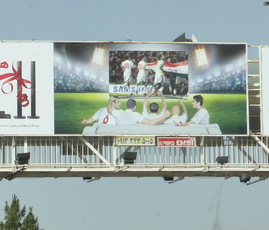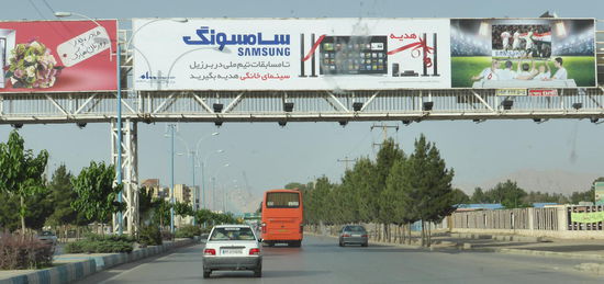 Es geht noch höher auf 2600 m Höhe. Schließlich erreichen wir gegen 18.00 Uhr Kerman. Auf einer der Straßen-Reklame-Brücken wird die Fußball-WM