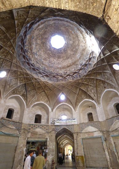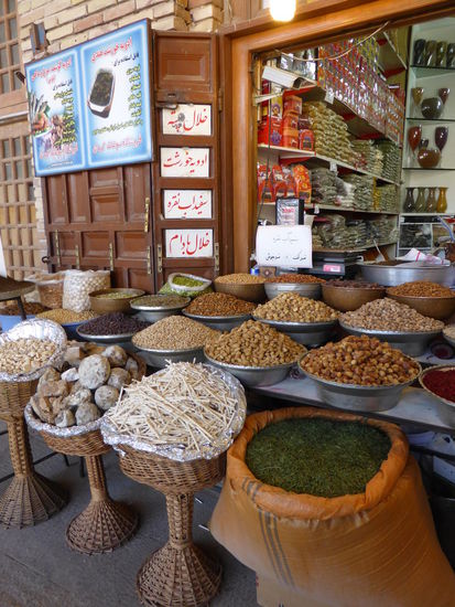 Nach dem Frühstück laufen wir zunächst durch den Basar von Kerman. Es ist ein riesiger Komplex mit sich überkreuzenden bis zu 700m langen überdachten Ladenstraßen, zu dem sowohl mehrere Moscheen als auch Hammam(s) gehört (haben). Man merkt hier, dass es sich um einen reinen Markt für die Bevölkerung handelt, denn es sind keinerlei touristische Artikel zu finden. Wir erstehen echten iranischen Safran und den bestens bekanntem Kerman-Kümmel.