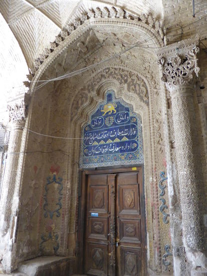 The attractive Moshtari-ye Moshtaq Ali Shah is the mausoleum for Sufi mystic Moshtaq Ali Shah, and other Kerman notables. Moshtaq Ali Shah was renowned for his singing and ability with the setar (a four-stringed instrument), and is apparently responsible for adding the fourth string to the setar (which literally means 'three strings'). He eventually fell so far out of favor with the local religious community that he was stoned in the Jameh Mosque. Most of what you see, including the prominent blue-and-white-tiled roofs, are from the late Qajar period.