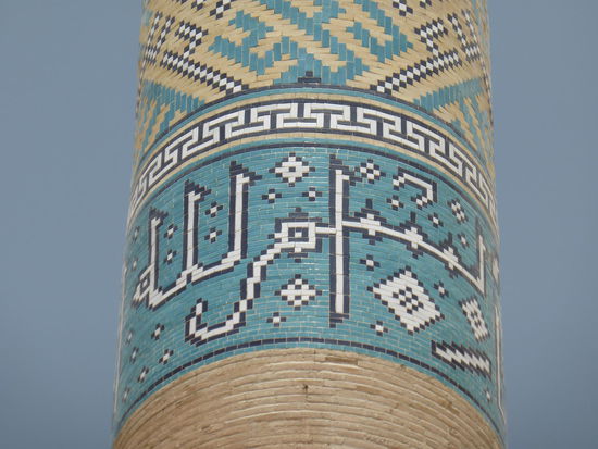 der Eingangsiwan ist über und über mit floralen, geometrsichen und kalligrafischen Fliesenmosaiken in Blau- und Türkistönen versehen