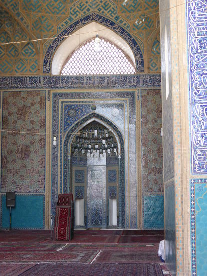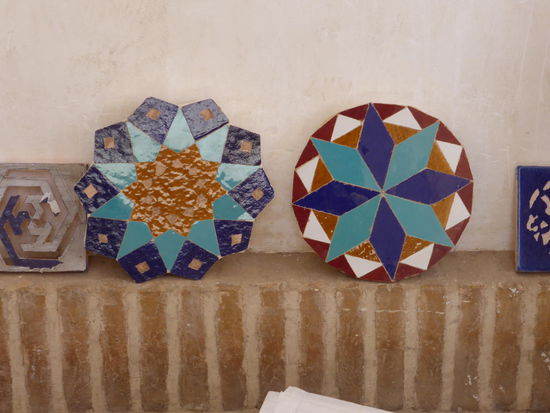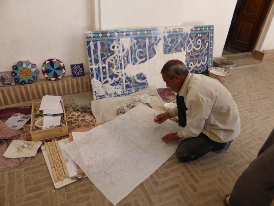 Nur 100 m weiter folgt dann die Besichtigung der Freitagsmoschee (Jame-Moschee). In der Moschee machen Studenten Mathematikaufgaben (Matrizen). Ein Restaurateur ist bei der Arbeit ein Mosaik wieder zu vervollständigen.