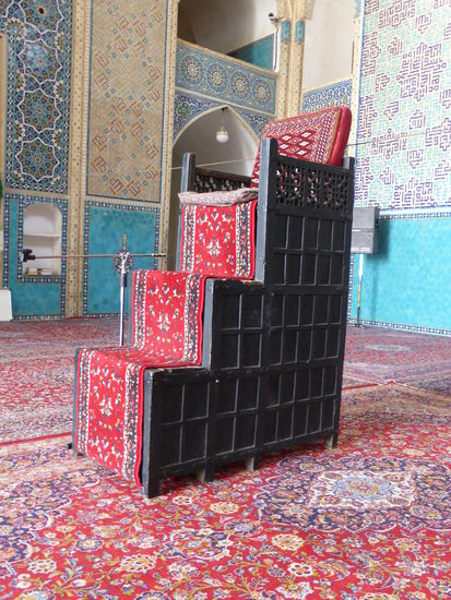 Zuerst entstand der Kuppelsaal und dann die seitlichen Gebetshallen, deren Dächer von quergestellten Stützbögen getragen werden. In muzzafaridischer Zeit , um 1375, wurde auch der hohe Eingangsiwan fertiggestellt und ein großer Teil des Fliesendekors angebracht. Die beiden Minarette, die den Portal-Iwan mit 48 m Höhe zum höchsten inn Iran machten, stammen aus den Jahren 1523-1577.
