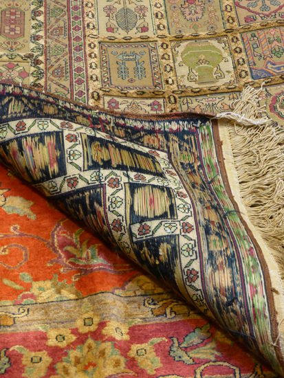 dieser Teppich ist nicht geknüpft! - eine spezielle Art Teppich, der Nadelarbeit ist, denn auf der Rückseite sieht man die Fäden.