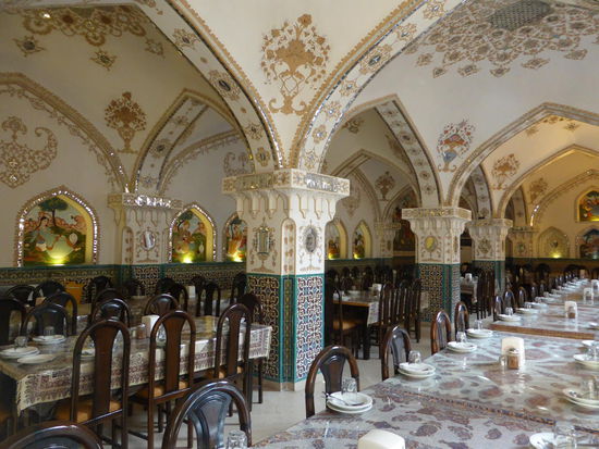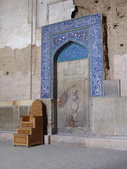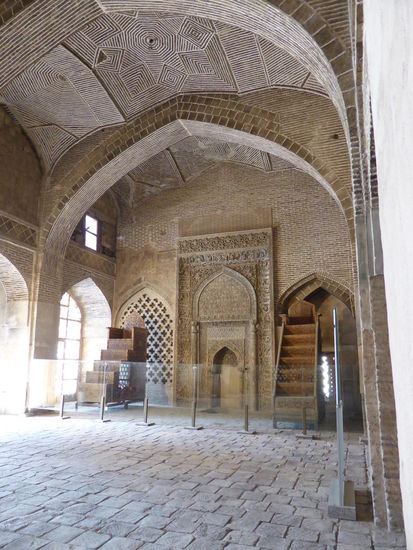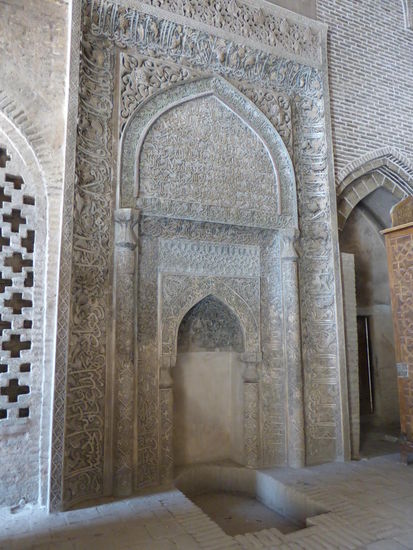 In den Gebetsraum rechts vom Westiwan ließ llkhan Oljertu 1310 das wohl schönste Stuckmihrab Irans einbauen. Dort befinden sich auch zwei alte hölzerne Minbars.