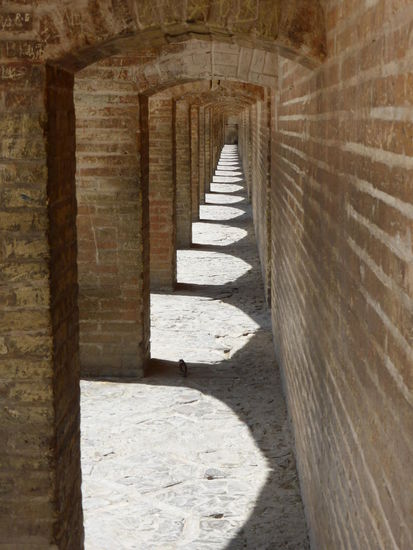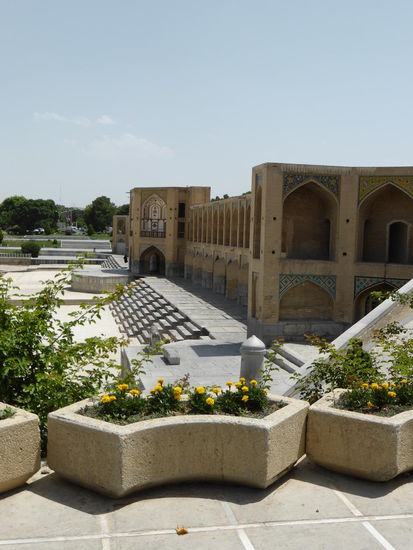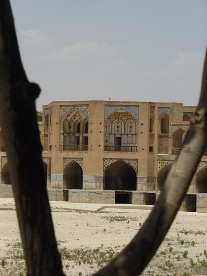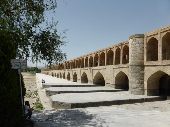 Die Khaju-Brücke (Pol-e Khaju) wurde um 1650, in der Zeit von Shah Abbas II., erbaut. Sie hat 23 Bögen, ist 132 Meter lang und 12 Meter breit. Da sie zweigeschossig ist, kann man auf zwei Ebenen den Fluss überqueren. Sie hat auch die Funktion eines Dammes und besitzt Schleusentore unterhalb der Bögen. Sehr reizvoll ist, dass sie auf der flussabwärts gewandten Seite bis zur ehemaligen Wasseroberfläche hinab getreppt ist und man auf diesen Stufen sitzen kann. Dies ist besonders angenehm, wenn an heißen Tagen abends die Temperaturen sinken. Der mittlere Pavillon wurde in safawidischer Zeit von den Königen und ihrem Gefolge als Beobachtungsplatz für Wasserspiele benutzt. Aber heutzutage gibt es kein Wasser mehr. Die Frage nach möglichen Protesten aus der Bevölkerung wird verneint, wir wissen was gemeint ist.