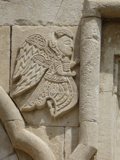 Die Außenwände der Kirche sind sehr unterschiedlich gestaltet. Während die Fassaden des älteren Baus bis auf Flechtmuster relativ schmucklos sind, ist der neuere Teil durch Felder und Blendnischen gegliedert, die überwiegend mit Pflanzenornamenten und Tier- und Heiligendarstellungen in Flachrelief geschmückt sind. So sind die herrlichen Zierbänder und Kartuschen an der Aussenfassade der jüngerern Bauteile deutlich zu sehen.