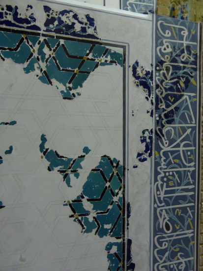 Besonders interessant sind die Teilrestaurationen - vorgezeichnete geometrische Muster auf weißem Putz, die in der Farbe der Fayencefliesen (bewußt einen Kick heller) angestrichen werden.
