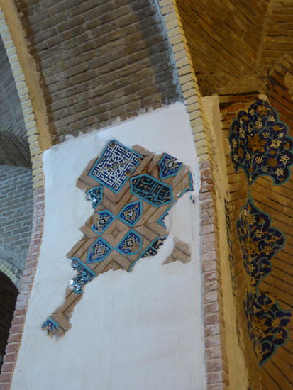 Hier sind die Mosaiken noch einzeln herstellt und in Mörtel verlegt worden, in späteren Zeiten hat man das relativ aufwändige Verfahren durch den Einsatz bemalter Fliesen ersetzt, wie man in Isfahan sehen kann.