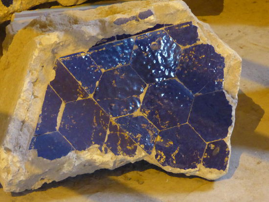 Im hinteren Gebäude ist der wertvollste Teil, der auch der Moschee den Namen gab, in Resten erhalten: die dunkelblauen Fayancemosaiken aus Lapilazuli z.T mit Goldverzierungen. Die anderen Blautöne sind aus Kobalt und die Türkistöne aus Kupfer- und Zinnoxid geschaffen.