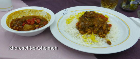 Wir halten uns recht lange auf in der Blauen Moschee und somit bleibt nur ein knappes Stündchen bis zum Abendessen im Hotel. Es gibt zwei verschiedene, etwa säuerlich schmeckende Suppen, Salatbar und das im Reiseführer angepriesene Khorescht-e-Gheimeh - für uns mit Lamm und die Mitreisenden vegetarisch. (Sauce auf Tomatenbasis mit Spalterbsen, frittierten Kartoffeln und getrockneten Limetten). Auf dem Zimmer kann ich dann das Bordbuch von heute schreiben, da wir nicht so spät wie gestern den Tag beenden.