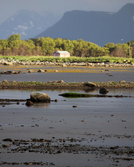 Schön war anschließend, nachdem sich das Wetter gebessert hatte, ein Spazierganz etwas abseits bei Kalle ans Meer. Die Wildcamper hier hatten es wirklich gut: Felsen zum Angeln, schneebedeckte Gipfel, ein See, ebene, weiche Wiesengelände, Kletterfelsen und ein plätschernder Bach.