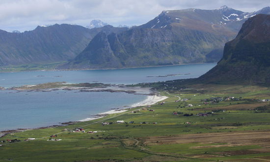 Ausgangspunkt der anschließenden Wanderung zum Strand von Kvalvika war der Torsfjord bei Fredvang im Norden der Insel Moskenesøya im Süden der Lofoten. Gegenüber des kleinen Schotterparkplatzes am Torsfjord begann der gut sichtbare Trampelpfad über den Berg hinunter zur Bucht. Er führte durch typisch norwegisches Gelände mit vielen Beerensträuchern und niedrigen Bäumen, an denen man sich an etwas steileren Stellen gut festhalten konnte. Unterwegs überquerten wir sattgrüne Wiesenhänge, auf denen sich Schafsherden tummeln und man hörte in der Stille das Gemurmele der kleinen Bachläufe, die unten am großen Strand endeten. Eine tolle, rauhe Landschaft und super Zeltplätze weiter unten auf dem ebenen Wiesengelände am Strand.