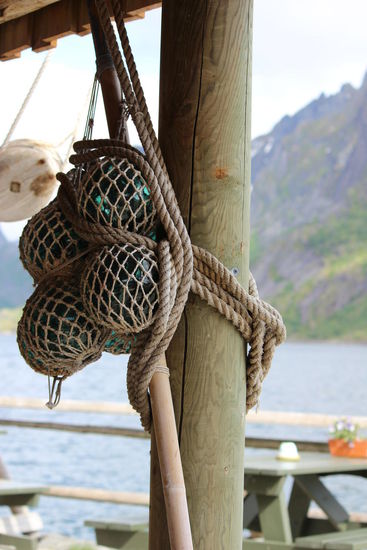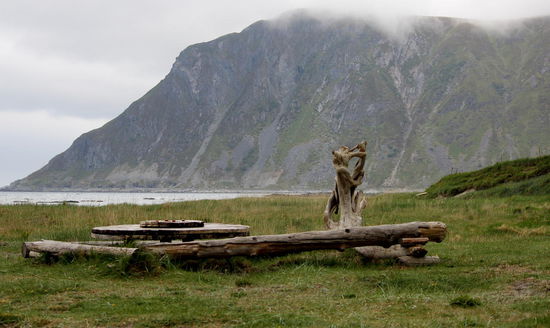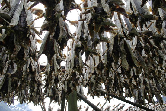 Auch am Strand von Ramberg waren Holzgerüste aufgestellt, auf denen Stockfische zum Trocknen aufgehängt waren.