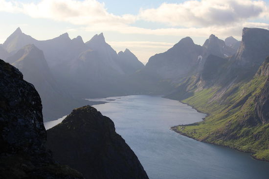 Am nächsten Tag beschlossen wir bei herrlichem Sonnenschein nach 19 Uhr zum Gipfel des Reinebringen zu wandern. Es war ein kurzer, aber wirklich sehr steiler Aufstieg. Oft krabbelten wir auf allen Vieren oder zogen uns an den Seilen, die dort angebracht waren, nach oben. Ist man dann aber nach ca. 1- 1,5 Stunden endlich oben, glaubt man seinen Augen nicht zu trauen. Diesen Anblick werde ich in meinem ganzen Leben niemals vergessen.