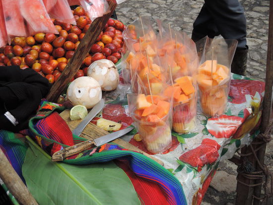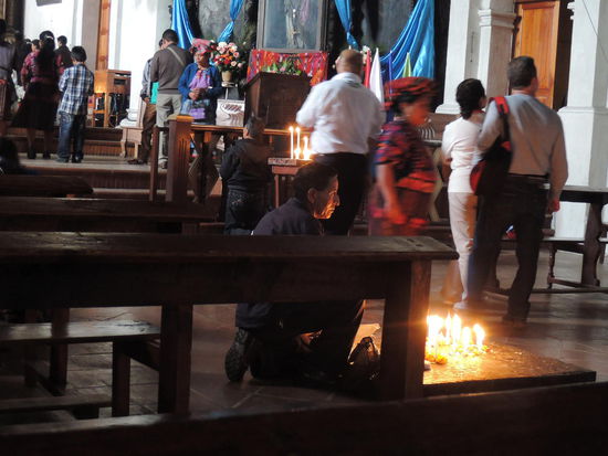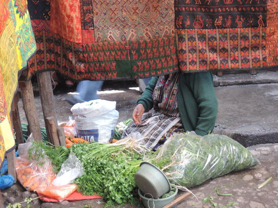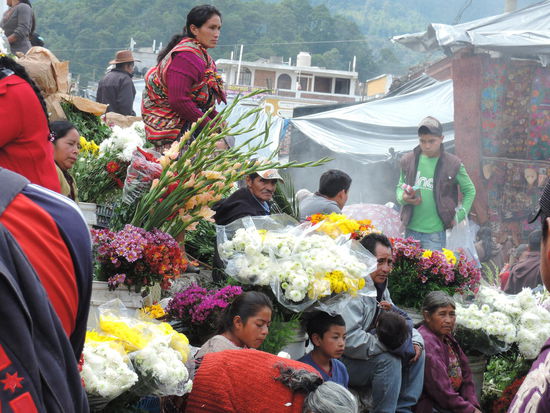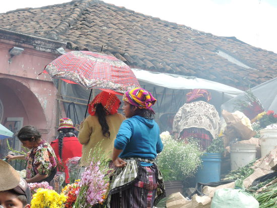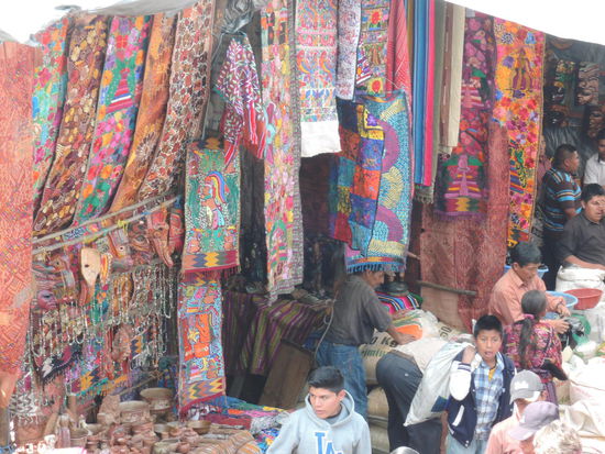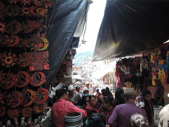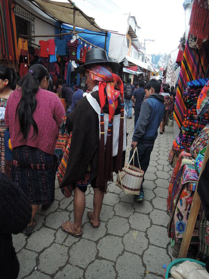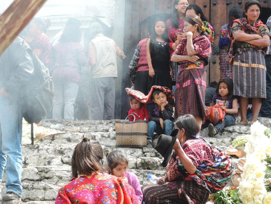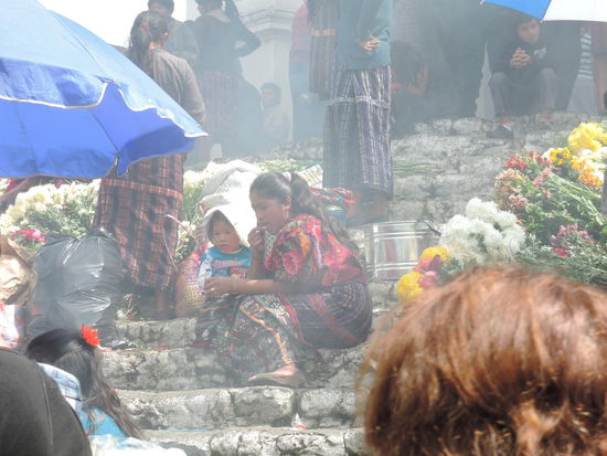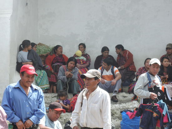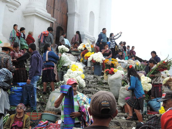 Am Sonntag ging es dann mit dem Bus ueber Holperstrassen auf den Markt von Chichicastenango, welches auf ca. 2000m liegt. Der an jedem Donnerstag und Sonntag stattfindende Markt vor den Treppen der Kirche Santo Tomás, der größte in Mittelamerika, zieht neben Händlern und Käufern aus Guatemala - einheimische Quiché wie auch Mam, Ixil, Cakchiquel und andere - sehr viele Touristen an. Bis heute wird der Ort vor der Kirche jedoch noch von Maya-Schamanen genutzt, die Weihrauch und Kerzen auf ihm anzünden und manchmal Tieropfer (Hühner) darbringen. Die 18 Stufen der noch vom alten Maya-Tempel stammenden Treppe entsprechen den Monaten des Maya-Kalenders.