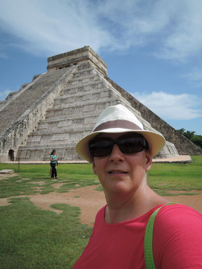 03.08.2014: Heute habe ich einen Ausflug zu der bekanntesten Mayastaette auf der Yucatanhalbinsel unternommen - Chichen Itza. Hier in Playa del Carmen gibt es Touranbieter ohne Ende. Ich bin mal zu einem der groessten Anbieter hin und habe mir einige Touren zeigen lassen. EasyTours, die sind wohl auch dafuer bekannt, dass alles reibungslos ablaeuft. Die Tour dauerte den ganzen Tag und kostete 45 USDollar. Ich wurde um 07.50 Uhr vor der Haustuer abgeholt und nach einer ca. 2stuendingen Fahrt haben wir den Cenote Ik Kil erreicht. Ein Cenote ist ein Kalksteinloch, das durch den Einsturz einer Höhlendecke entstanden und mit Süßwasser gefüllt ist. Der Begriff stammt von den Maya der mexikanischen Halbinsel Yucatán. 954 Cenotes sind im mexikanischen Bundesstaat Quintana Roo bekannt. Sie besitzen im Durchschnitt eine Tiefe von etwa 15 Metern, vereinzelt auch von über 100 Metern. Man kann also von oven reinschauen oder in diesen Cenotes auch schwimmen, schnorcheln oder tauchen. Natuerlich bin ich da auch kurz reingehuepft. Super klares, frisches Wasser! Auf der Fahrt habe ich mit einer mexikanischen Volksschullehrerin (Anabell) angefreundet. Sie konnte ueberhaupt kein Englisch und ich mit meinen paar Brocken Spanisch. War aber ein gutes Training!