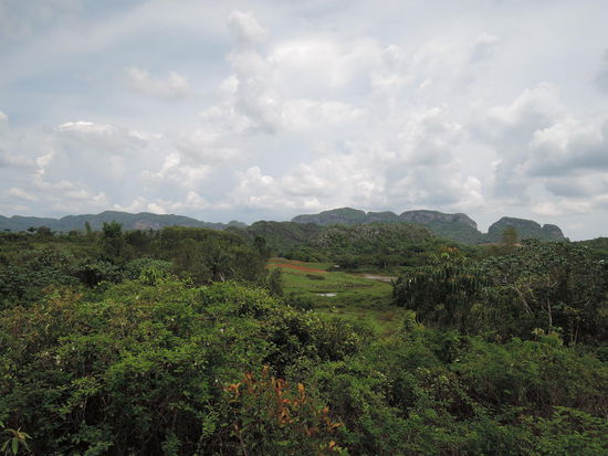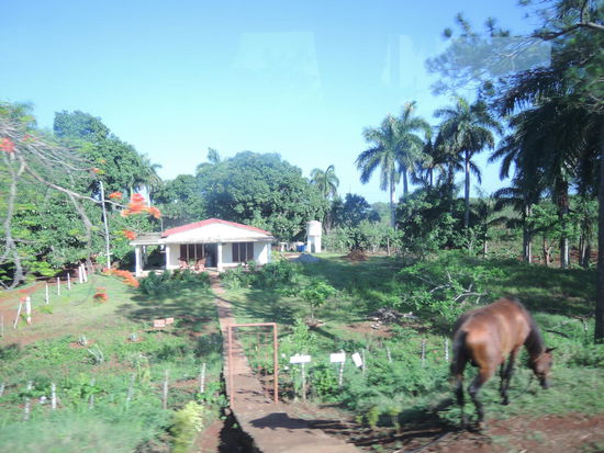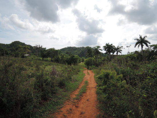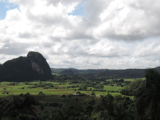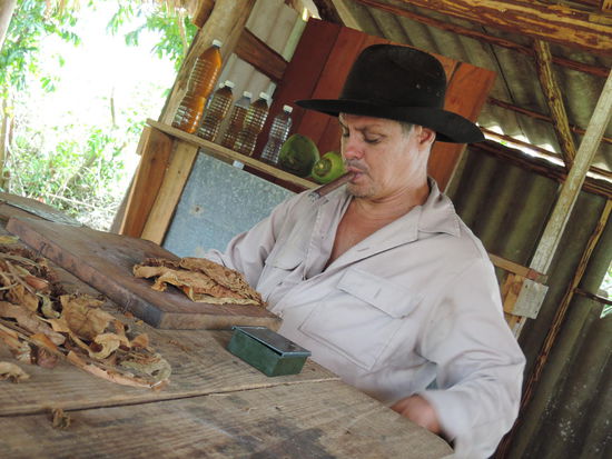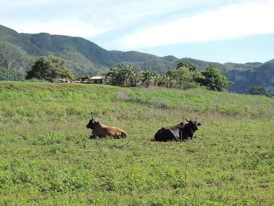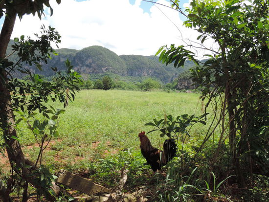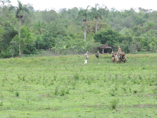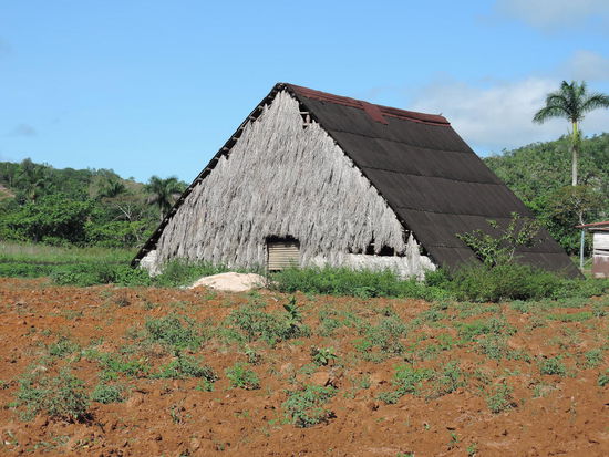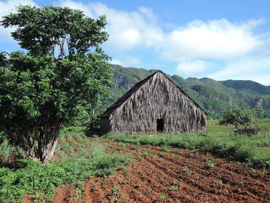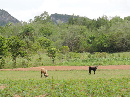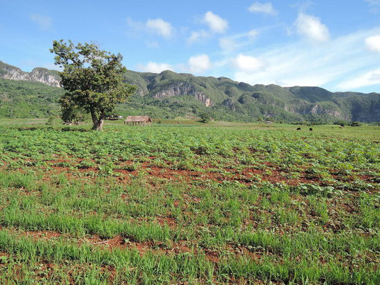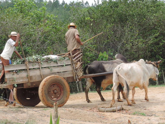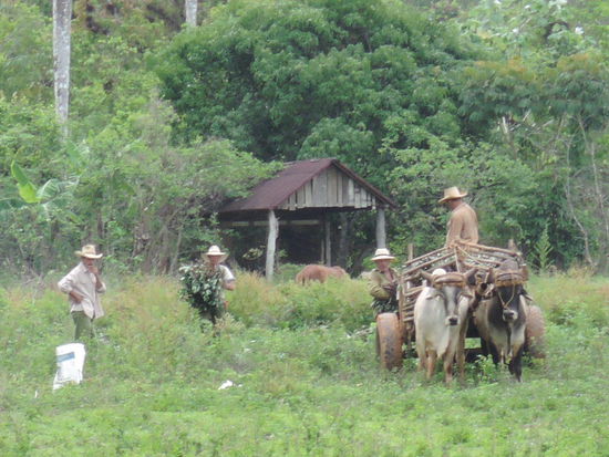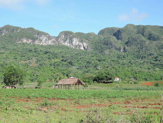 28.5.2015: Nach einer 7stuendigen Busfahrt mit der nationalen Busgesellschaft Viazul taucht das wunderschoene Valle de Vinales mit seinen roten Talboeden und den gruen ueberwaachsenen Kegelfelsen (mogotes) auf. Hier gibt es viele kleine Bauernhoefe, die Reis, Kaffee, Gemuese und Tabak anbauen und sich Kuehe, Pferde, Schweine und Huehner halten. Die meisten der Bauern bestellen ihre Felder noch per Hand und traditionellen Ochsenkarren. Die Bauern sind in Kooperationen zusammengeschlossen und muessen einen bestimmten Prozentsatz ihrer Ernte an den Staat abgeben. Hier wird auch Tabak angebaut und verarbeitet und man sieht ueberall die ueblichen Trockenschuppen fuer den weltberuehmten Tabak.