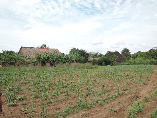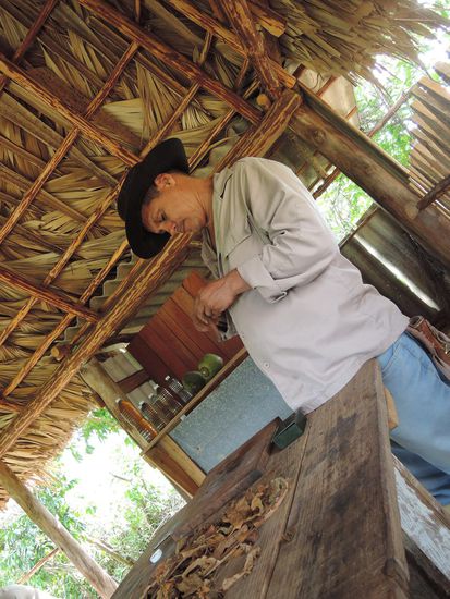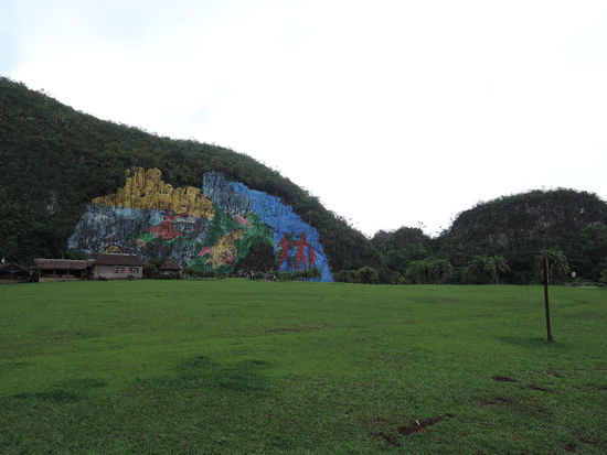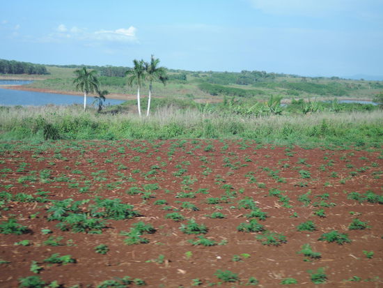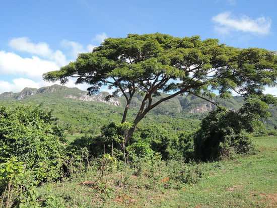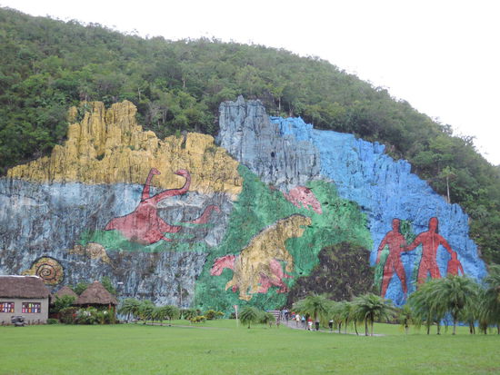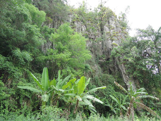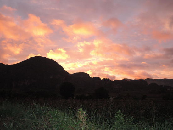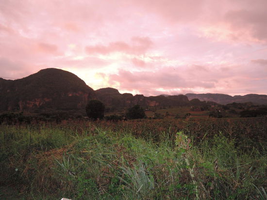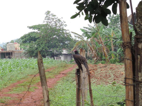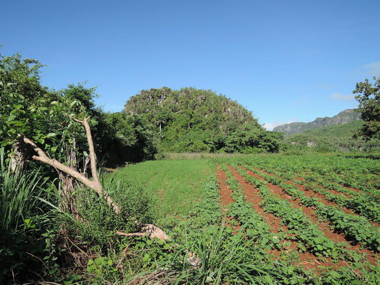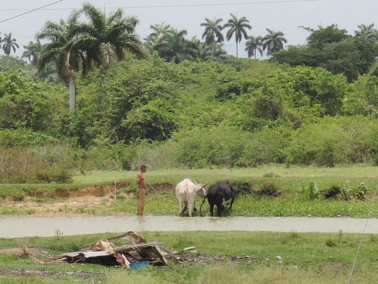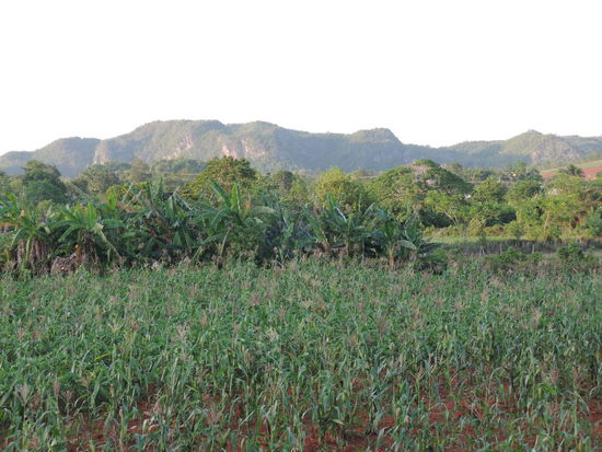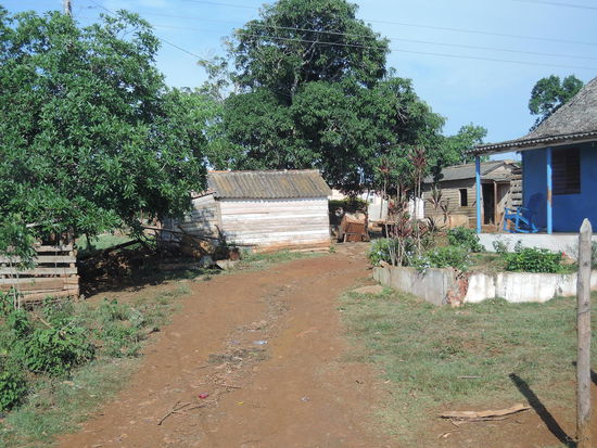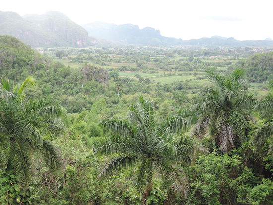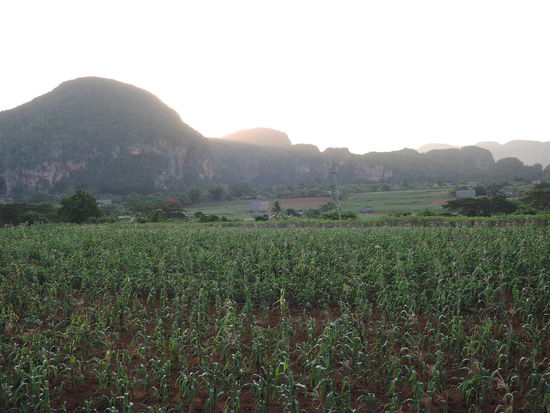 28.5.2015: Nach einer 7stuendigen Busfahrt mit der nationalen Busgesellschaft Viazul taucht das wunderschoene Valle de Vinales mit seinen roten Talboeden und den gruen ueberwaachsenen Kegelfelsen (mogotes) auf. Hier gibt es viele kleine Bauernhoefe, die Reis, Kaffee, Gemuese und Tabak anbauen und sich Kuehe, Pferde, Schweine und Huehner halten. Die meisten der Bauern bestellen ihre Felder noch per Hand und traditionellen Ochsenkarren. Die Bauern sind in Kooperationen zusammengeschlossen und muessen einen bestimmten Prozentsatz ihrer Ernte an den Staat abgeben. Hier wird auch Tabak angebaut und verarbeitet und man sieht ueberall die ueblichen Trockenschuppen fuer den weltberuehmten Tabak.