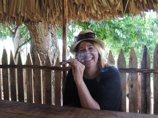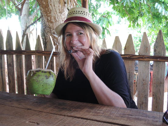 Ich wollte da auch nochmal zu Pferd die Gegend erkunden und der Deny hat seinen Cousin Luis engagiert, um mit mir durch die Landschaft zu reiten. Nach einem 1stuendigen Ritt haben wir an einer Tabacco-Farm gehalten und der Besitzer hat uns den Prozess von der Aussaat bis zur fertigen Zigarre erklaert und auch eine Zigarre gerollt. Anschliessend gab es eine Rauchprobe und dazu hat der geschaeftstuechtige Mann auch noch eine CocoLoco (Kokosnuss mit Rum und Kokoswasser gefuellt) verkauft. Ich habe meinen kubanischen Gaucho auch auf eine Kokosnuss eingeladen und zum Dank hat er mich gleich am Abend zum Salsatanzen eingeladen.
